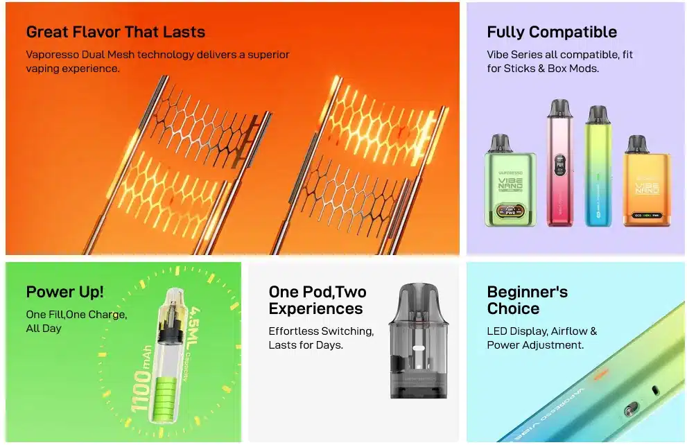 El Vibe SE de Vaporesso combina simplicidad y tecnología avanzada para ofrecer una experiencia de vapeo intensa, duradera y sin complicaciones.